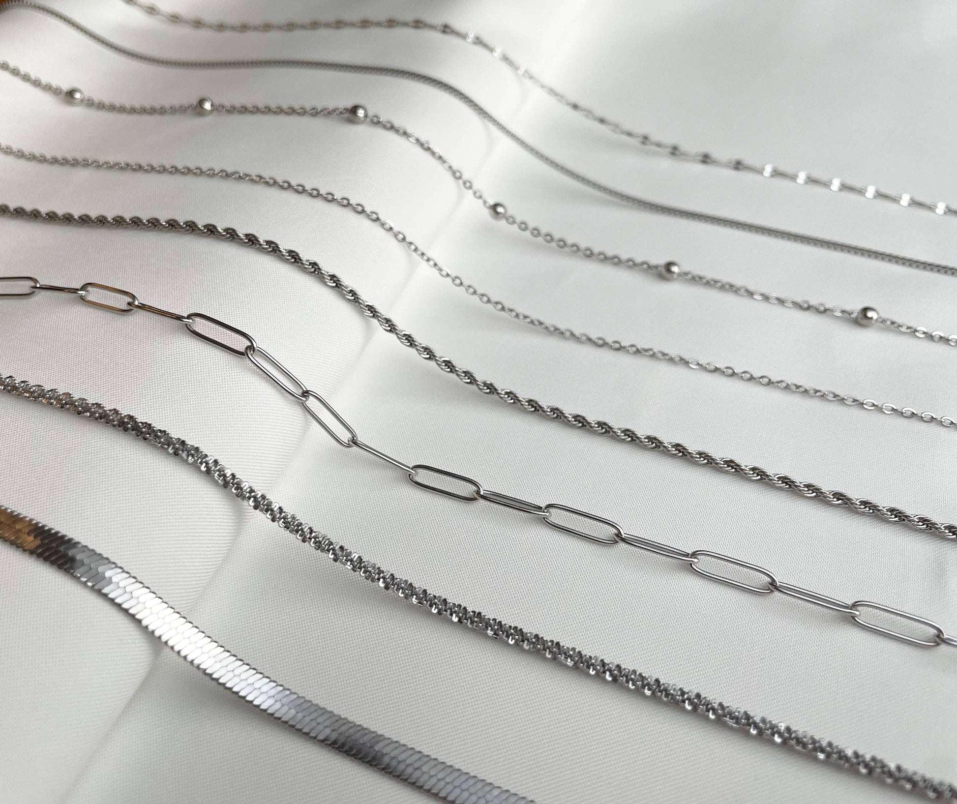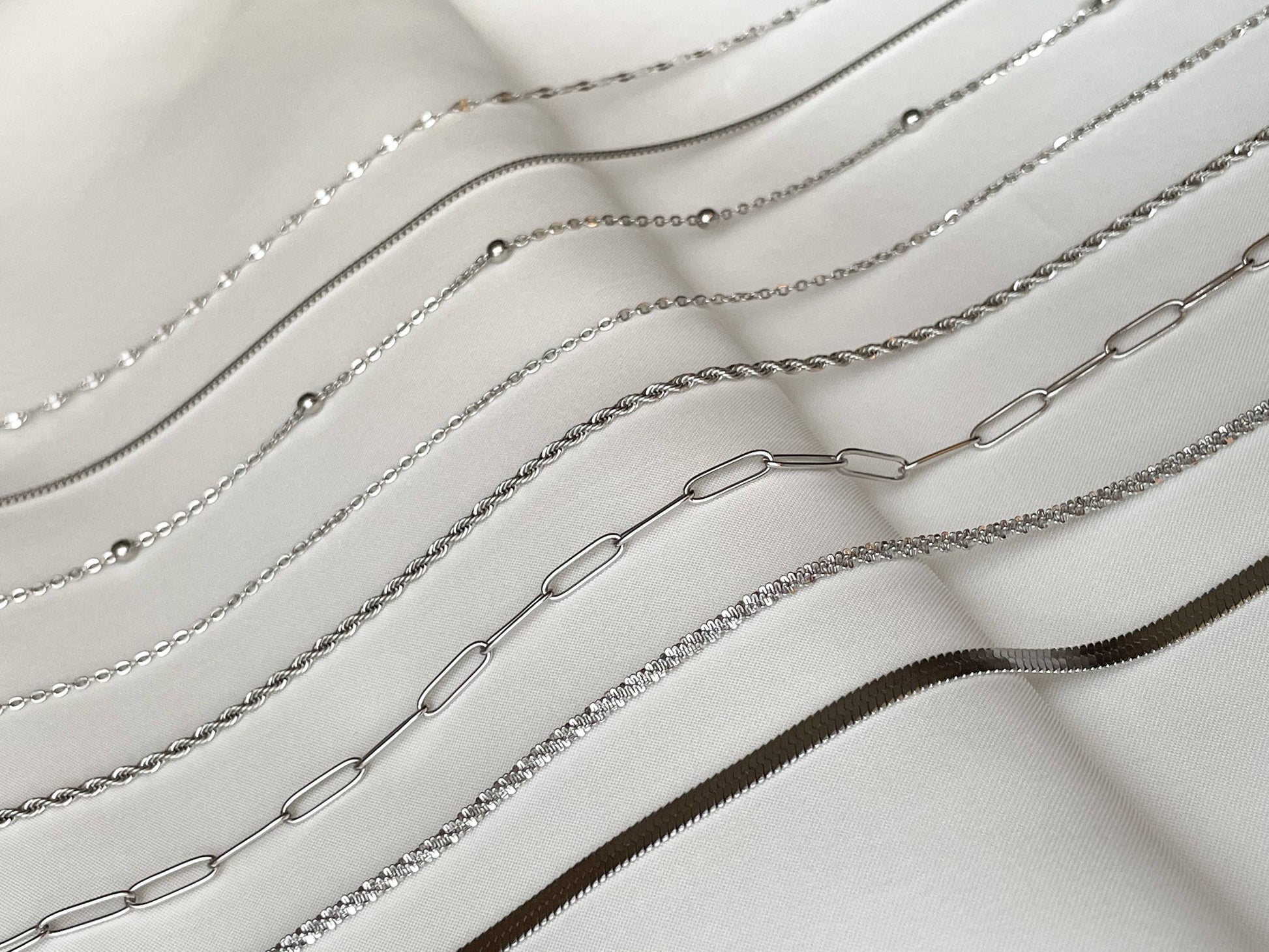 Dainty stainless steel chain necklaces that can be layered / stacked are ideal for mixing and matching! Combine your favorite silver link chains to create a seamless look. Plus, they are tarnish resistant and waterproof; you can wear them to the pool or gym and they won't change color.