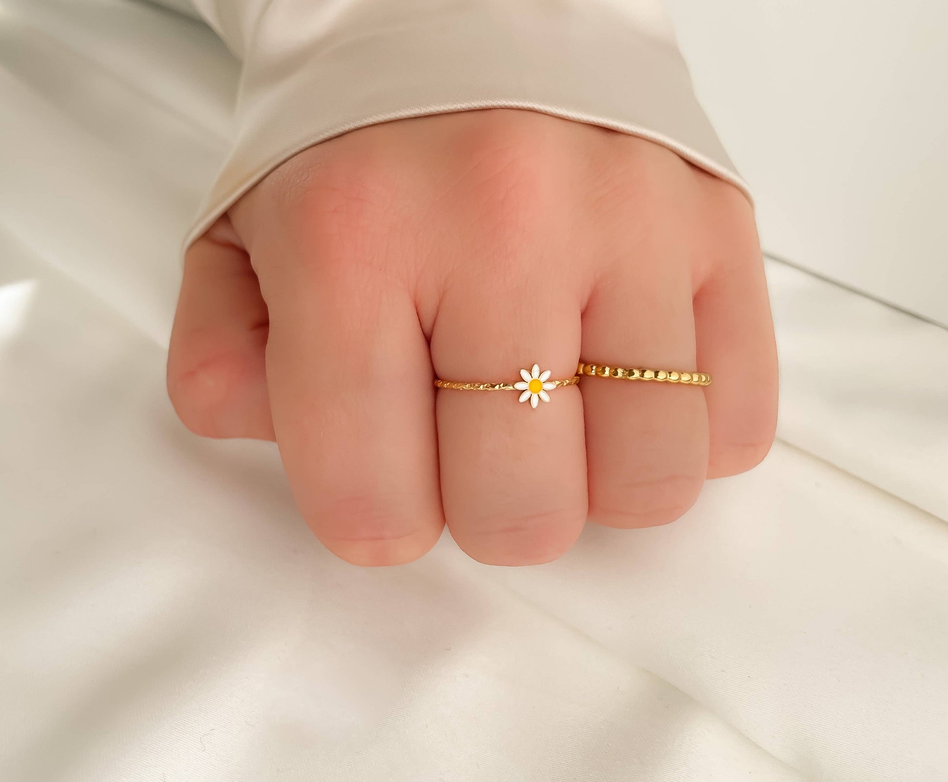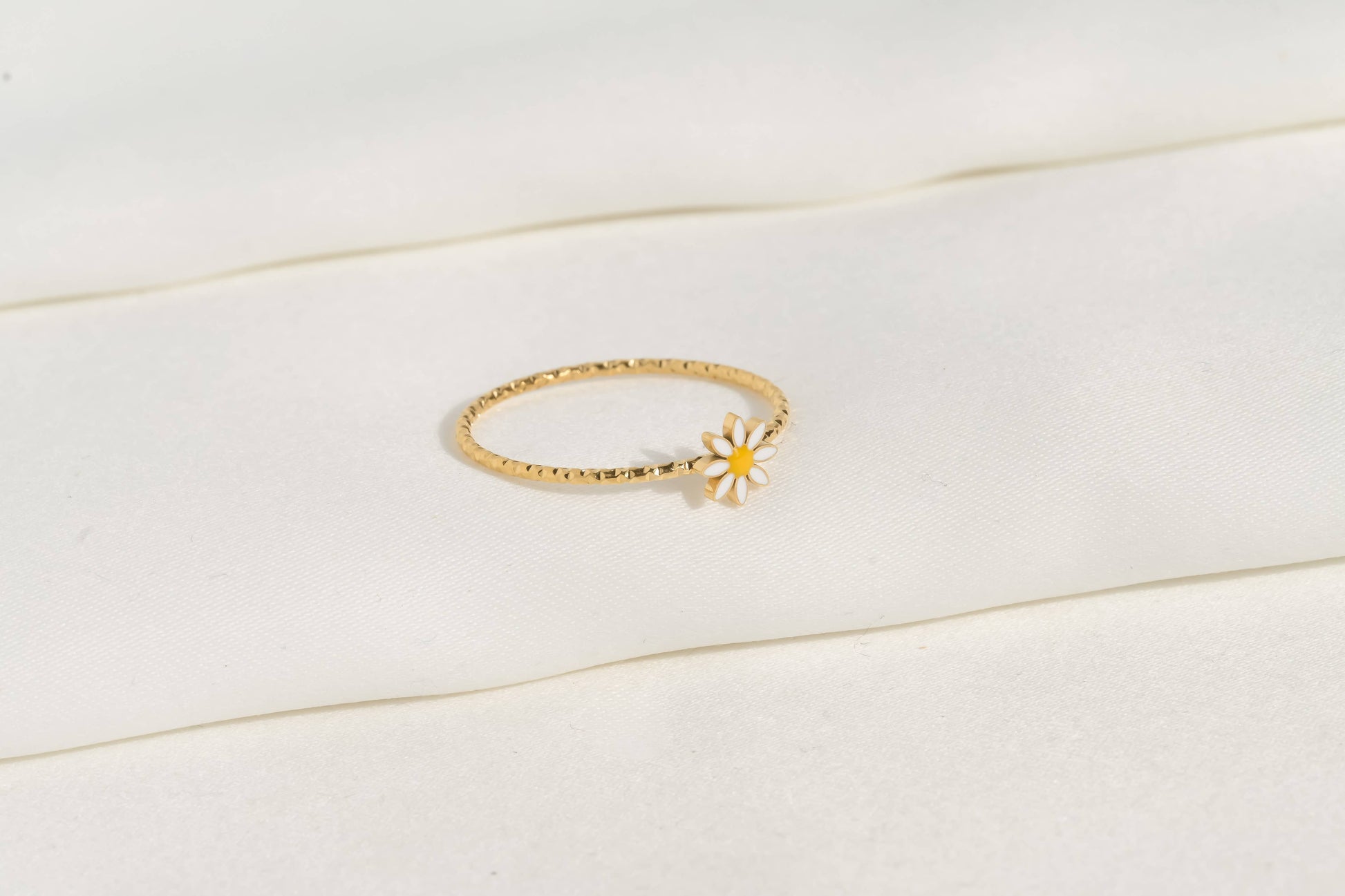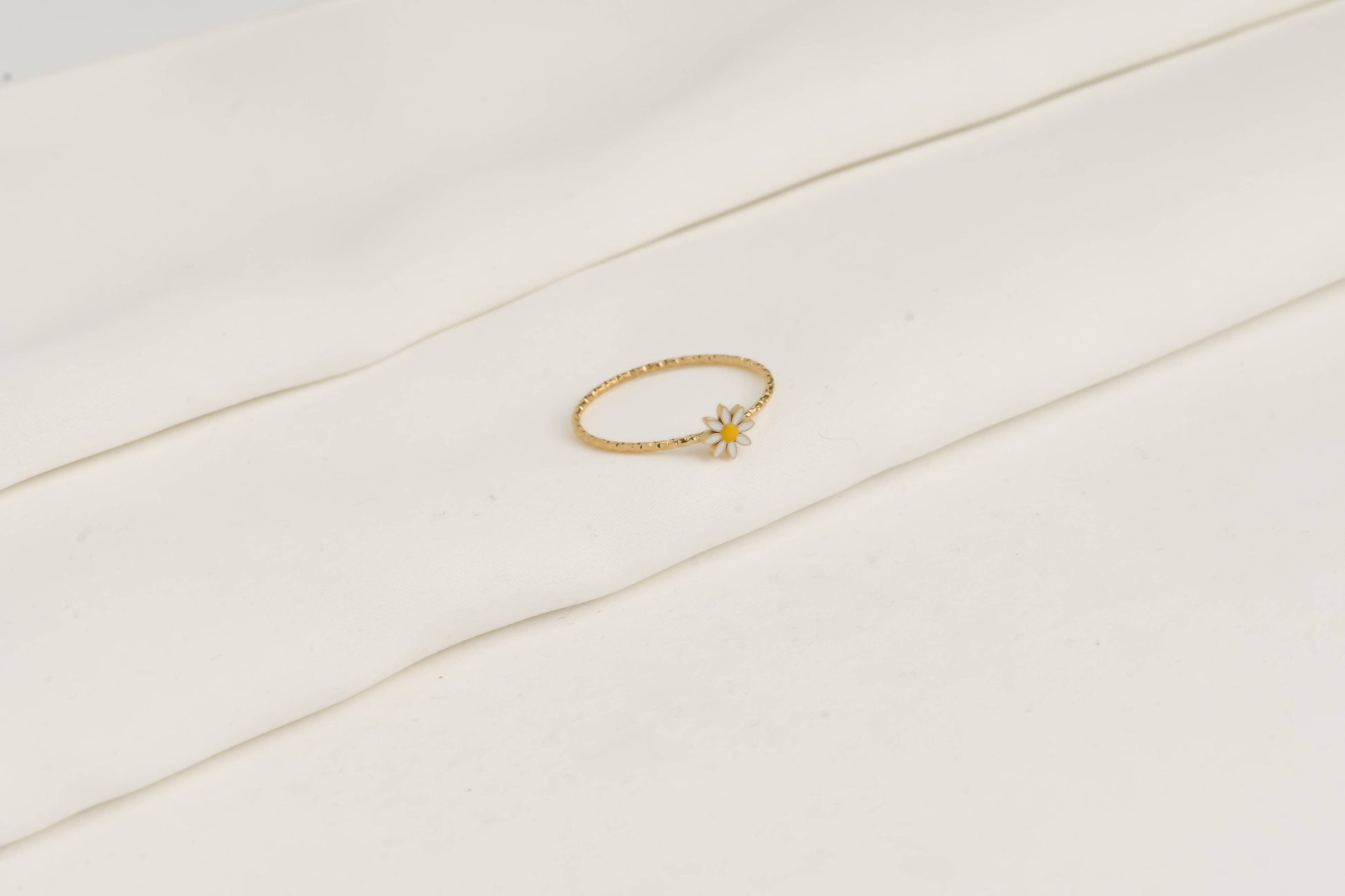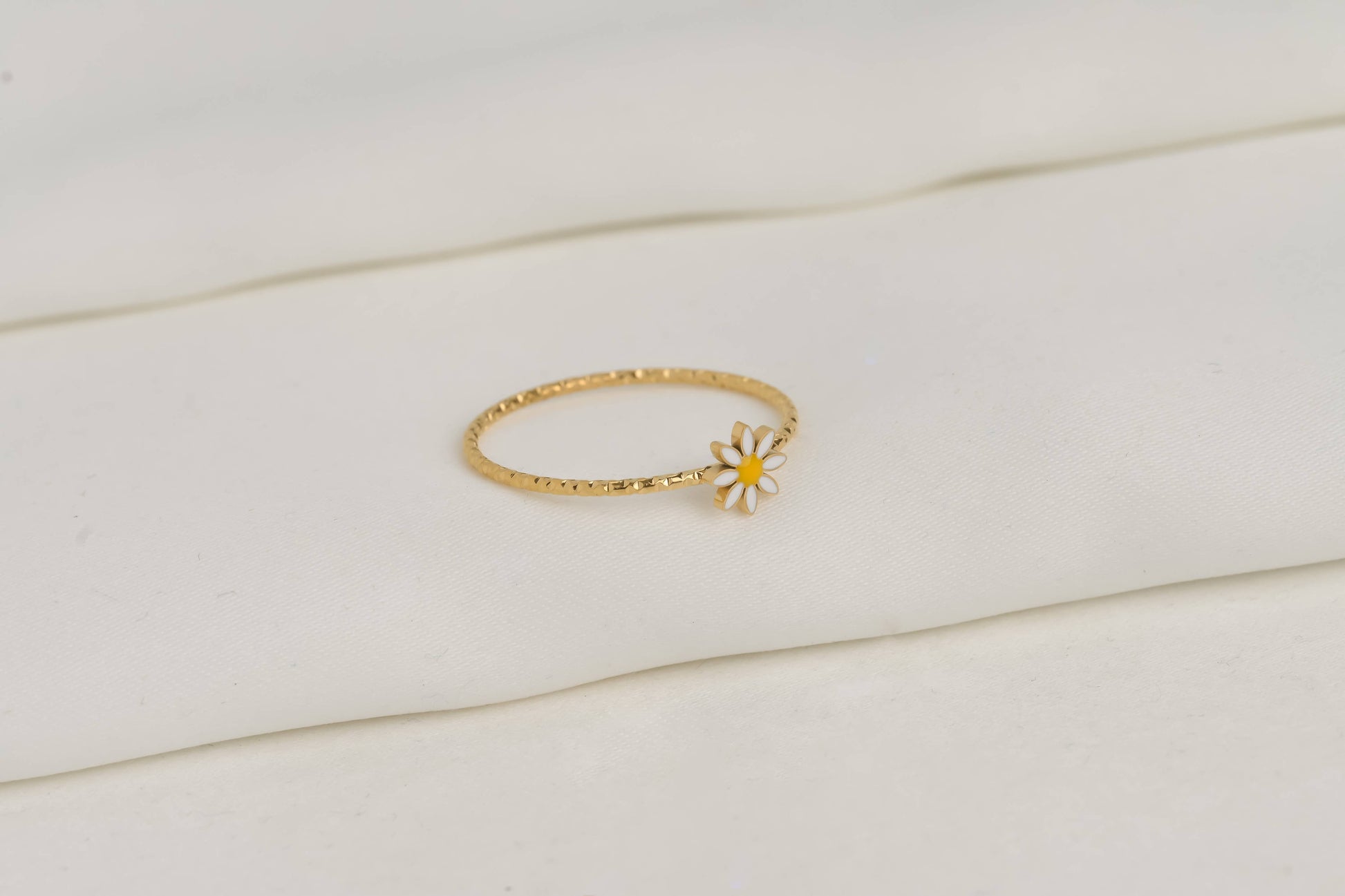 Elevate your style with our minimalist Gold Daisy Ring, expertly crafted from 18k gold PVD plated stainless steel. Its warm gold tone features a subtle red undertone, and the white daisy design adds a touch of minimalistic elegance to your look.