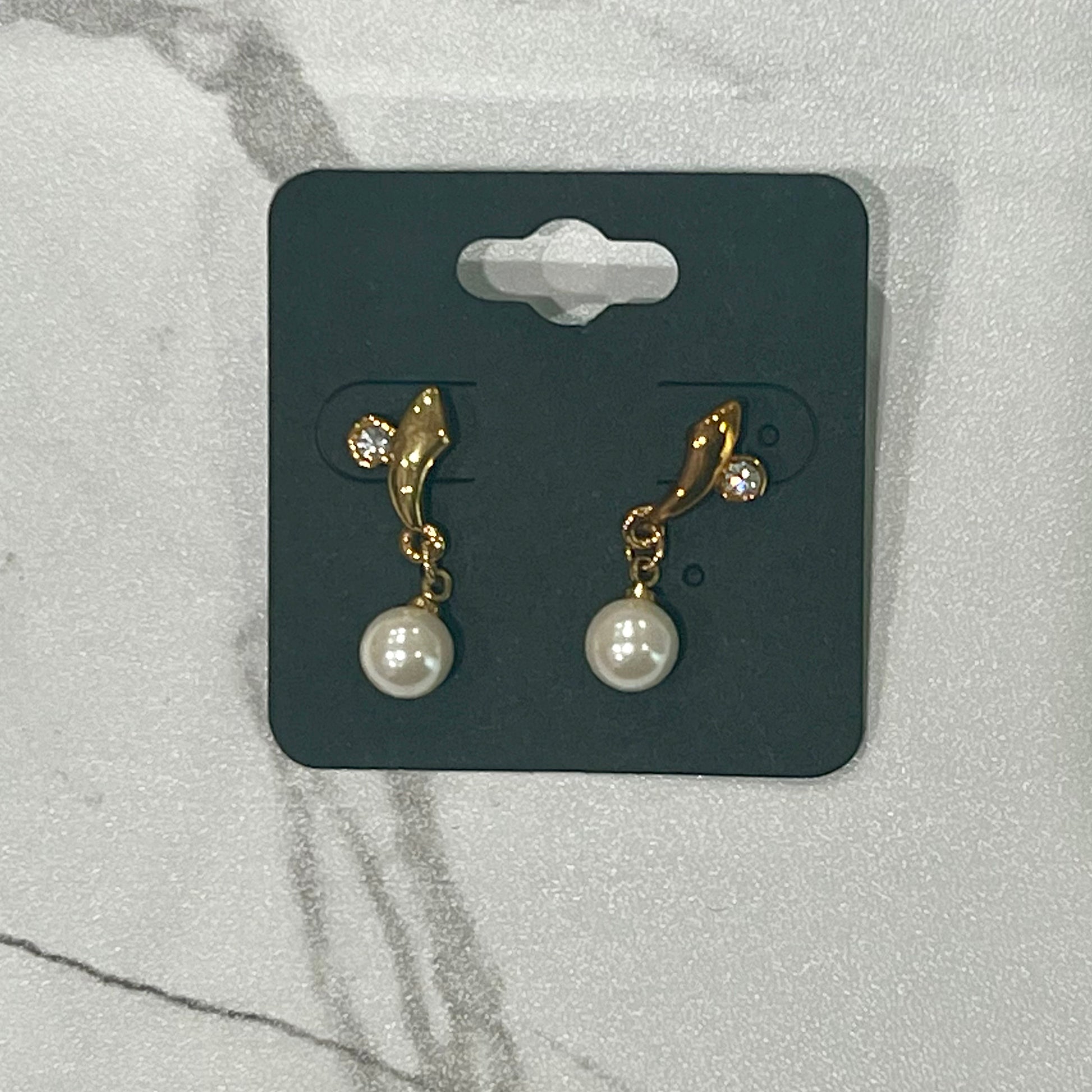 These earrings are a pair of elegant gold-toned pieces, each featuring a shiny pearl drop and adorned with a small, sparkling gemstone.