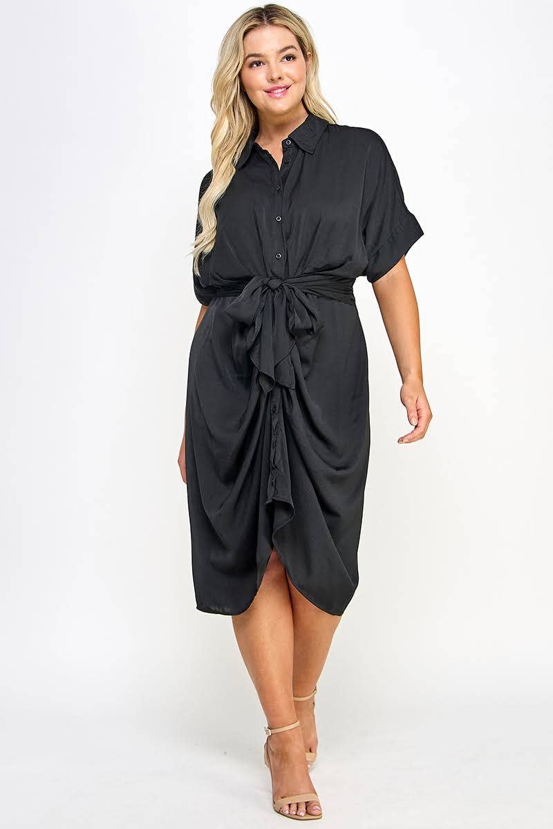 Button down dress, featuring a washed satin fabric, shirt collar, banded dolman short sleeves, pleated and draped front, hi-low hem, and waist tie detail for a flattering silhouette!