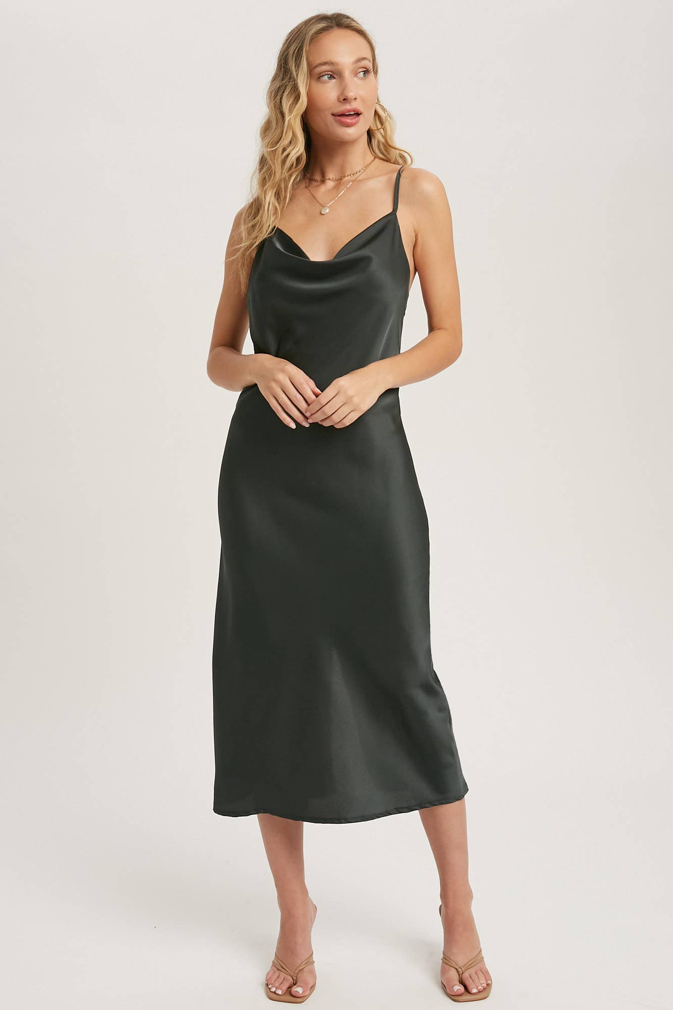 Woven satin midi dress featuring a draped neckline, adjustable spaghetti shoulder straps, and a slit at the back gives this classic LBD an elevated silhouette.
