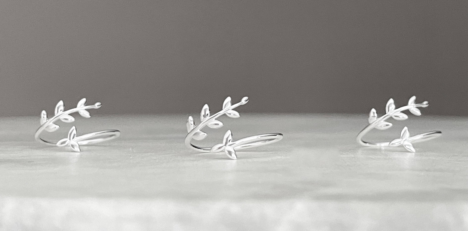 A dainty wrap ring crafted in sterling silver! Inspired by the olive branch, a symbol of peace and abundance, this stunning ring is easily adjustable and features beautifully crafted olive leaves along a delicate band.